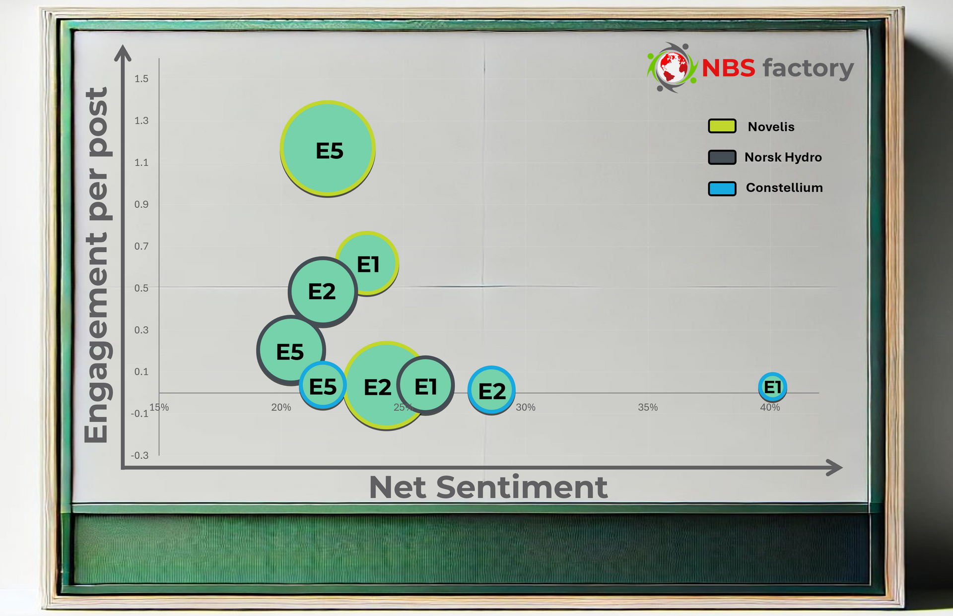 -E1 (Climate change): With 7,619 posts, Novelis has a net sentiment of 24%, and engagement per post is 0.6.