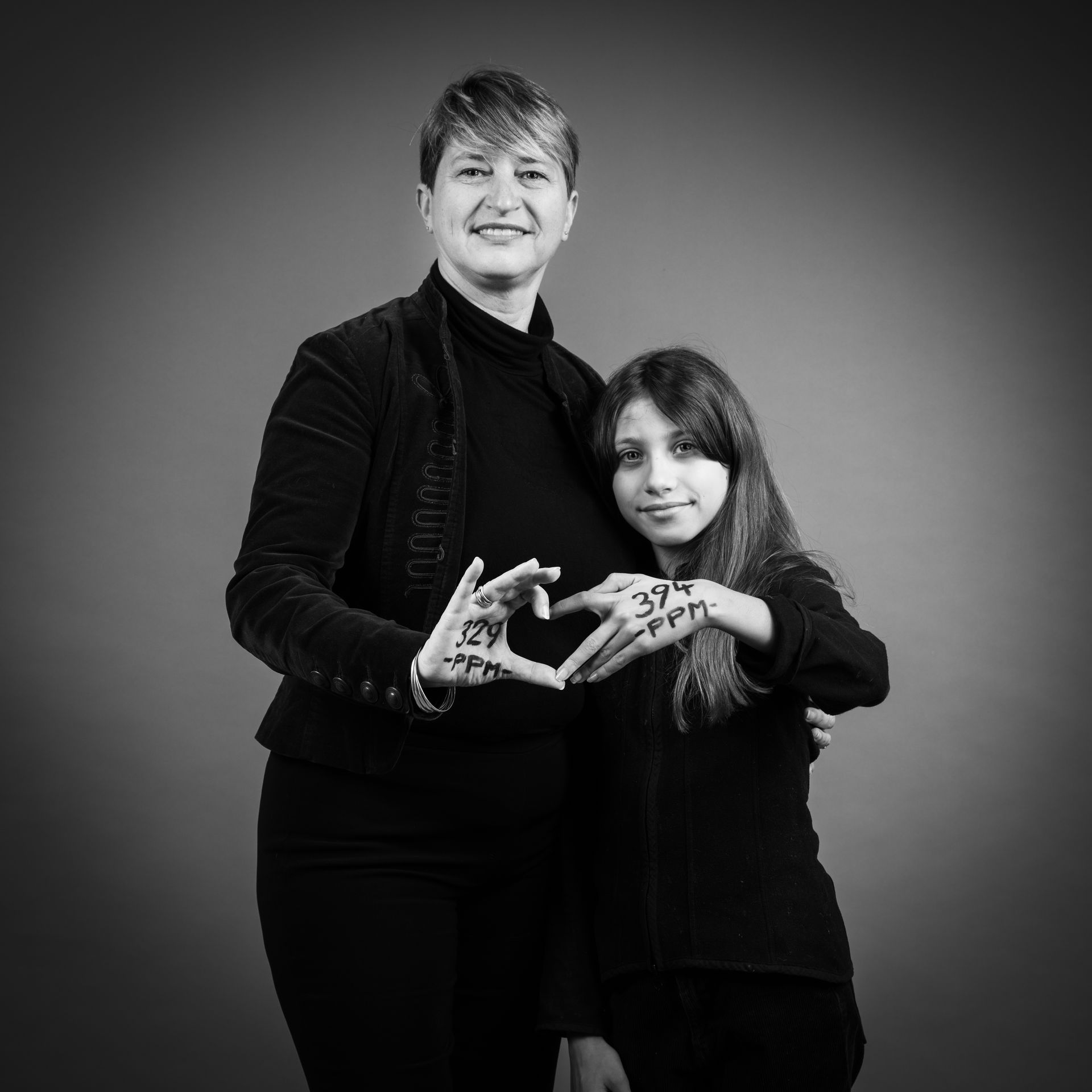 Anne Dumesges (CEO, founder) and daughter, Charlotte, with the PPM from the year they were born written on their hands. PPM (“parts per million”, the concentration of CO2 in the atmosphere) measures the impact of human activities on the climate.