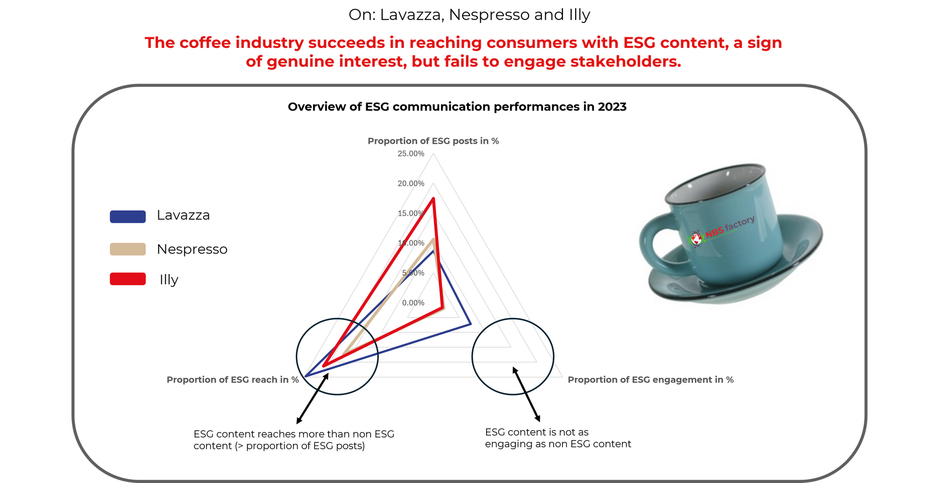 Where the high reach of ESG publications is common to all 3 companies, Lavazza's engagement is the most striking, more than 5 points higher than the second brand (7.23% - 2.02%).